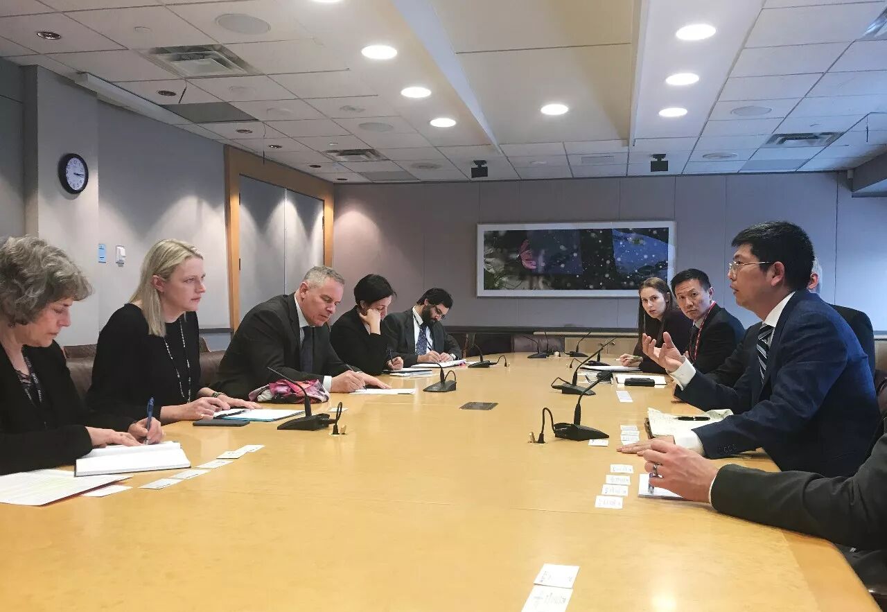在加拿大国际贸易部,助理副部长Ailish Campbell博士会同高级政策顾问、投资、贸易、中国事务等部门相关负责人参加了会谈。首先Ailish Campbell博士代表外交部长Chrystia Freeland女士、国际贸易部长Francois Philippe Champagne、加拿大驻华大使John McCallum对陈滨总裁团队的到来表示热烈欢迎,肯定了万丰在加投资和经营成果,同时祝贺万丰成功全资收购加拿大钻石飞机公司。陈滨总裁介绍了万丰在加企业的最新经营情况和发展战略,并对加拿大相关产业的发展提出了建设性设想和实施方案。Ailish Campbell助理副部长充分肯定了万丰在加拿大的战略和促进中加贸易的设想方案,表示将与万丰一起探讨制定适合相关产业发展的战略及政策,支持加拿大相关行业在全球化背景下更健康持续发展。