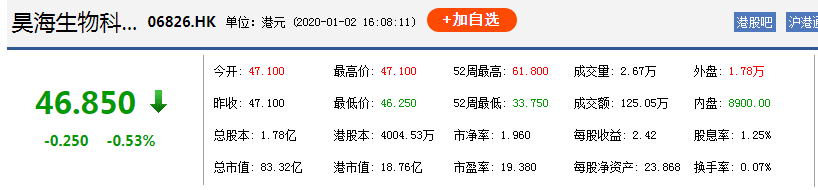 在这一对比下,昊海生物科技(06826,HK)算是走在了前面。2019年10月底,昊海生科(688366,SH)成功分拆上市,发行价89.23元/股。1月2日昊海生科股价为90.98元/股,但即使这样,昊海生科的股价也比在港股时的46.7港元/股高出一半多。